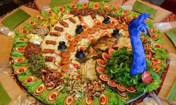 黎明之城,心之所向除了美不胜收的风景之外芒市也是名副其实的美食天堂孔雀宴、景颇绿叶宴过手米线、手抓饭、菠萝饭撒撇、圆子饵丝、稀豆粉椰子糕、泼水粑粑、泡鸡脚豌豆粉、小卷粉油炸蚕蛹、生牛肉、干巴酸扒菜、冰镇毛肚、泡鲁达……从朴实无华的路边小店到金碧辉煌的美食城你的胃准备好了吗? 01孔雀宴孔雀宴是傣家最具特色的宴席之一,汇聚了傣家最具特色的佳肴美味,采集原生态新鲜食材,用烤、炸、煎、炒、煮、凉、蒸、舂等傣家传统烹饪方法烹饪而成,再摆放成孔雀开屏的形状。对了,孔雀宴中可没有孔雀肉哦!