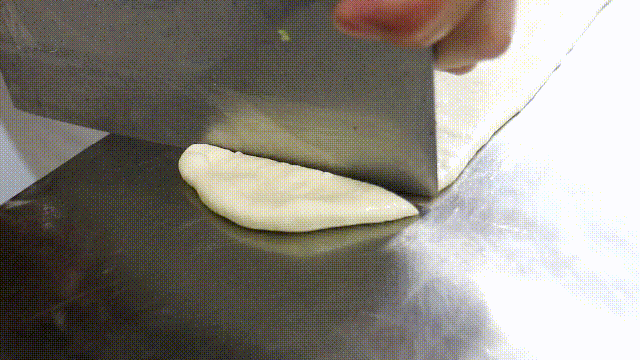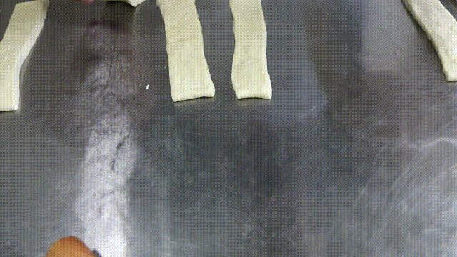把两个剂子叠起来一反一正地叠在一起,用手按压一下,再拉伸一下,这样炸出来的油条不会起,还可以轻松分开。