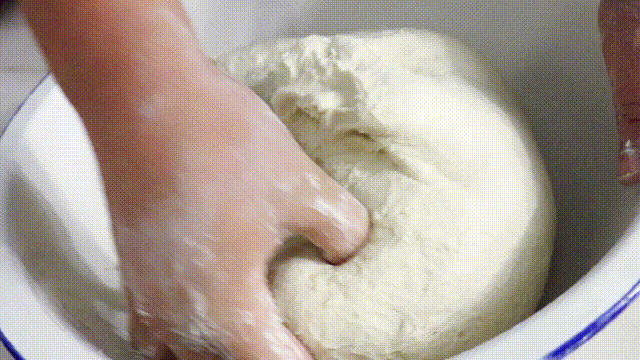 和面时一只手加水,一只手和面,从面盆的一边和起,先不要和实,要和成软一点的面絮。