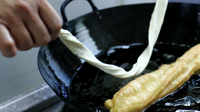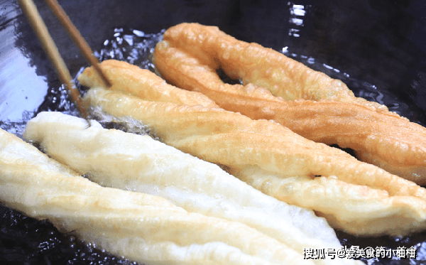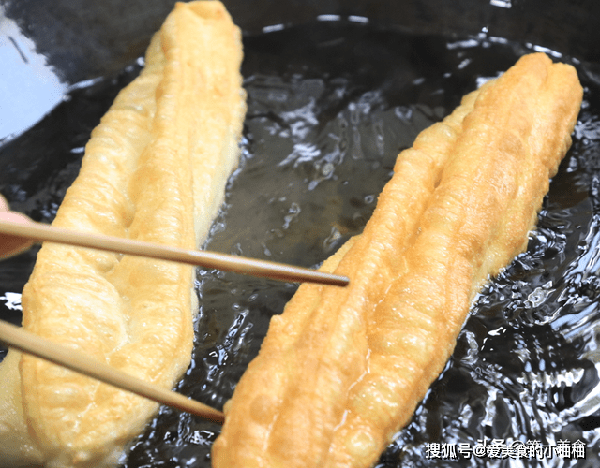 然后下入油条,刚下锅不要动,漂浮起来有打弯的地方用筷子轻轻一推就直了。