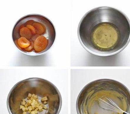 1.用朗姆酒浸泡杏脯2小时以上,然后切成小块备用。