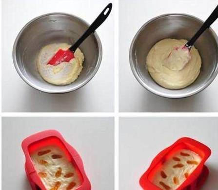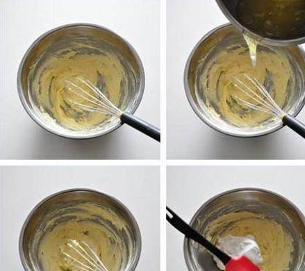 7.把三分之一的蛋白霜用刮刀均匀拌入黄油混合物中,再筛入三分之一的面粉拌匀。如此交替几次混拌成均匀富有光泽的蛋糕面糊,手法要快且轻。最后往里拌入杏脯。
