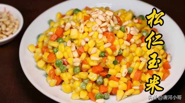 食材:鲜玉米粒、熟松仁、胡萝卜、黄瓜、鸡精、淀粉、盐、糖