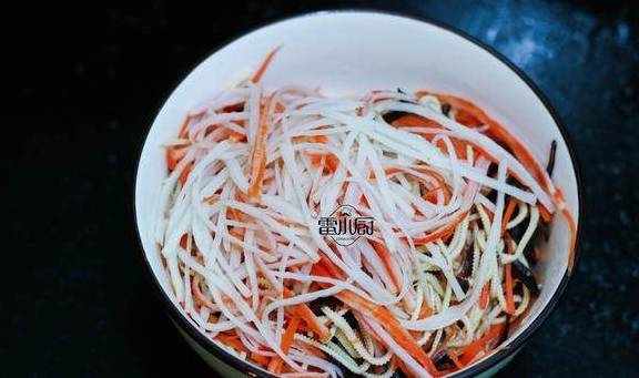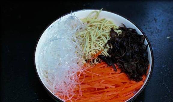 1、干豆腐用水冲一下切成丝,黑木耳提前泡发切成丝,胡萝卜洗干净,先切成片再切丝,绿豆粉提先用温水泡软,所有食材准备好装在一个盘子里。
