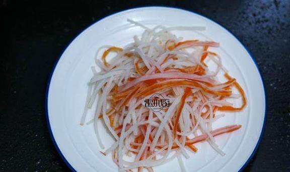 2、蟹肉棒,我买的是开袋即食的蟹肉棒,取出来之后撕成丝单独装在一个盘子里。