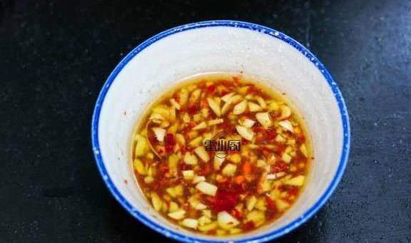 5、取一个小碗,加入剁碎的大蒜,半勺的食盐,半勺生抽,一勺调味汁(买的瓶装的),少量的陈醋,几滴芝麻油,少量的白糖,最上面放一勺干辣椒面,烧一点热油,将热油波浇入碗中拌匀调成调味料。