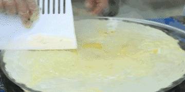 以上工作全部完成面粉也全熟了,然后老石熟练地转起锅子用铲子在周遭一刬,这个过程极其过瘾整个煎饼差不多就完成了一大半。