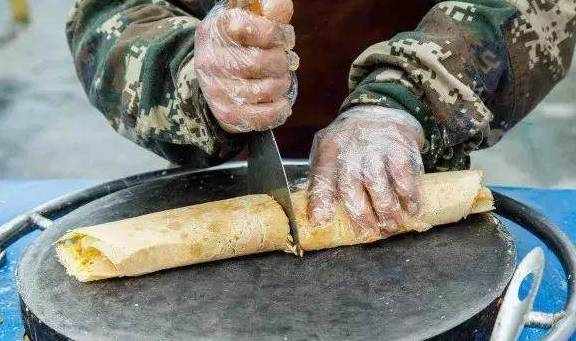 这个时候将煎饼一端折起,然后放上两片薄脆后再卷上,对准中间“咔嚓”一声切开,饭量小的女孩,吃这一半就饱了。老石说这样的很多,卖煎饼赚不了几个钱的。