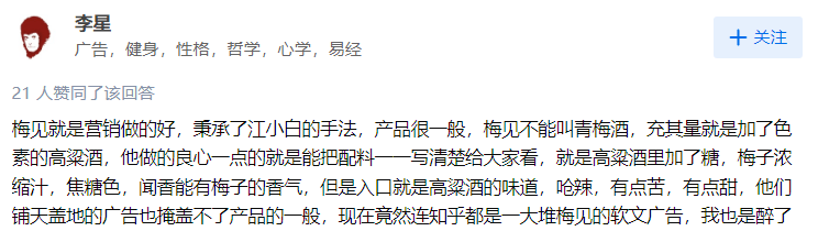 在网上也能看到不少对于梅见只注重营销而忽视产品口感的评价。梅见口感偏甜,前调是甜味,后调是有点后劲的高粱酒。虽然女性多偏好甜的口感,但是梅见酒的甜度有点过了;对男性来说这个甜度就更不用说了。