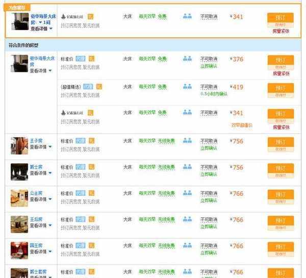 从价目表中可以看出,在这里住一晚并不是很贵。最便宜的豪华海景大床房每晚只需要341元人民币,最贵的爵士套房、公主房、王后房也只需766元。