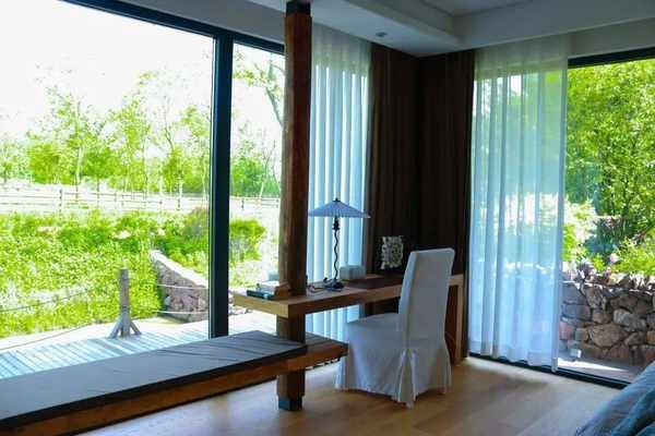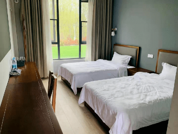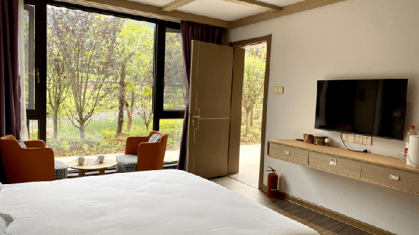 房间配备的观景大窗,将山景引入室内,躺在床上,便直接能观赏到紫蓬山绚美的山色。
