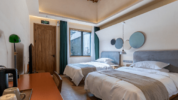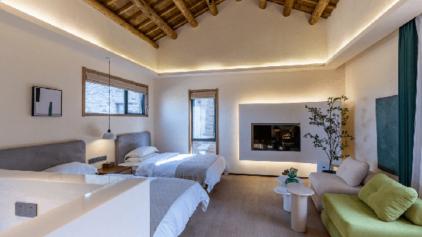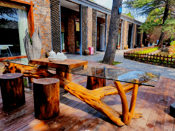 西庐印象四周树木葱郁,与山间风景融为一体,可登高眺远,可曲径通幽,建筑古色古香,高低错落,“野”的趣味也渗入民宿的每个角落。