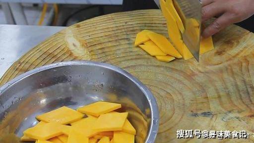 南瓜400克,削去外皮,切成菱形片,放在盆里。