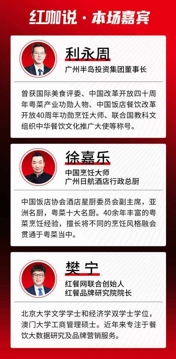 对此,红餐网系列化直播栏目《红咖说》第10期邀请到了改革开放四十周年粤菜产业功勋人物、广州半岛投资集团董事长利永周,以及中国烹饪大师、广州日航酒店行政总厨徐嘉乐做客直播间,围绕粤菜的传承与创新话题进行了探讨与分享。