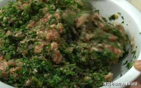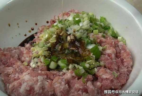 ②接着准备十块钱的肥瘦猪肉,剁碎成肉末,放食盐、生抽、老抽、胡椒、腌葱花、香油搅拌混合调味。