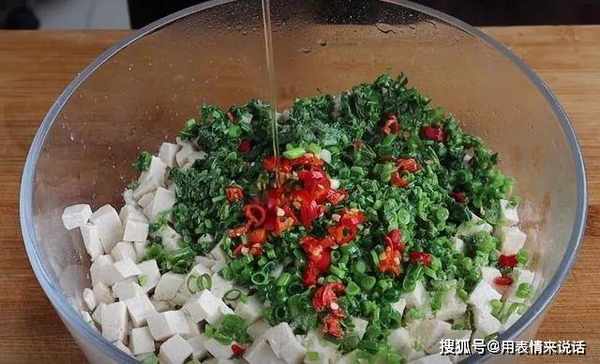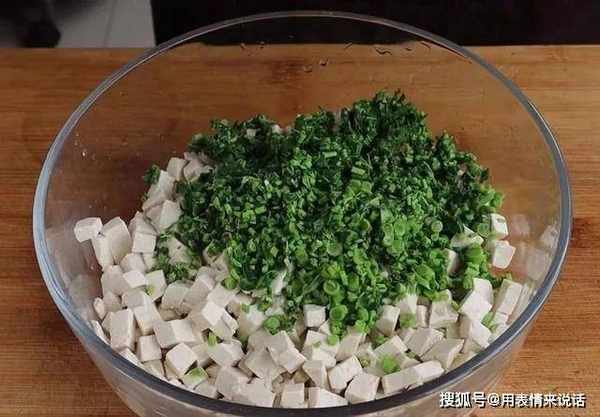 ⑤将焯水过的香椿和豆腐都放在碗中。