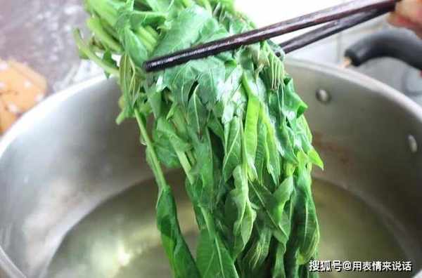①首先准备一把香椿,清洗干净,然后下锅焯水一分钟,使它保留翠绿色。