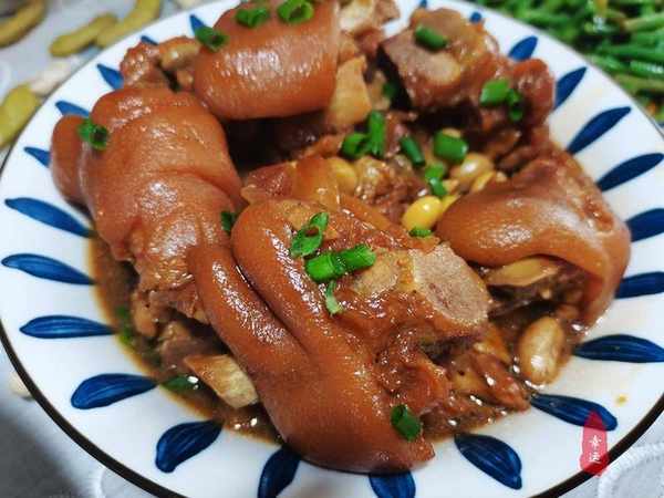 生产过程:猪蹄被市场上的销售人员切成块,猪毛被烧掉并处理干净;回到家里,小心地刮猪蹄的皮。将料酒和姜片放入清水中,煮沸水,撇去浮沫,取出猪蹄并洗净。烧热炒锅,放入食用油,转小火,放入冰糖。糖化后,将其变成棕色,倒入猪蹄中搅拌均匀。然后放入除盐以外的各种调味料,然后倒一瓶啤酒。如果不能用猪蹄代替,可以用开水补充。煮沸后,转中火,盖上锅盖,炖20分钟。揭开锅盖,倒入花生,继续炖10分钟。然后将猪蹄放入电压力锅中,将大豆和盐放入其中,将其设置为高热档,按下启动按钮,保温时间为40分钟,甚至更长。放入锅中后,撒上小葱花装饰。