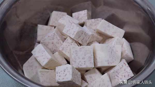 第一步:首先准备一个大芋头,去皮洗净,切成块。稍微大一点。芋头粉是糯的,太小了,无法融化。现在芋头也很贵。每公斤8元,相当于每公斤20多元。我们在挑选芋头的那一刻一定要选择一个手轻的大芋头。这个芋头粉被切成一个大盘子。加入少许盐,使其均匀覆盖,使其有一点味道,搅拌均匀后备用。