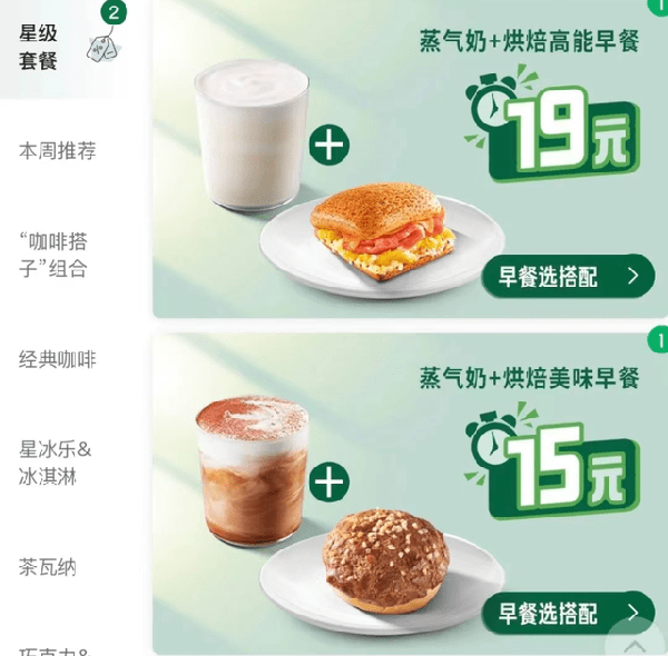 (加价15元可以把早餐组合中的饮品升级为星巴克咖啡);或者是一杯咖啡+面包=15元。