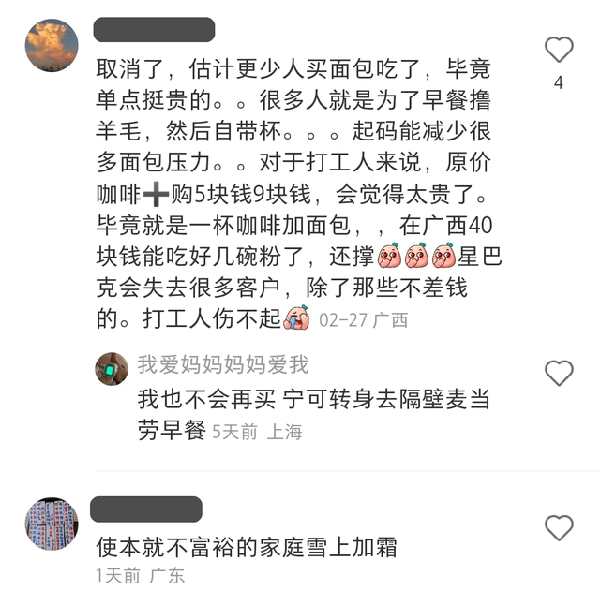 (同类比麦当劳,如果不买6折早餐卡,实际的早餐花费可能比星巴克要多)。
