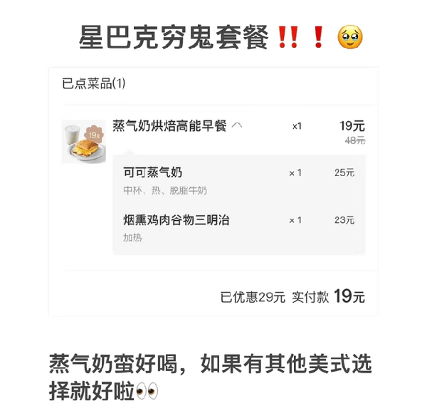 一份加蛋主食+一杯现调蒸汽奶=19元