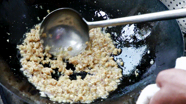 锅内多放一些油,油温烧至5成热时倒入准备好的小料,开小火炸3分钟,把小料炸干炸出香味,变黄以后倒入黄豆碎,保持小火炒5分钟,炒出黄豆中的水分。