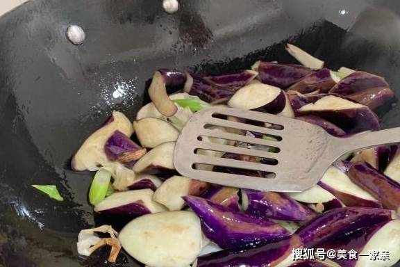 第三步:锅内放一匙羹油,下进大葱炒出香味,再把茄子倒进去不停慢慢翻炒,炒至有点变色的时候用铲子稍微压一压
