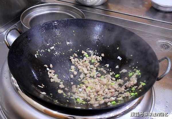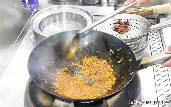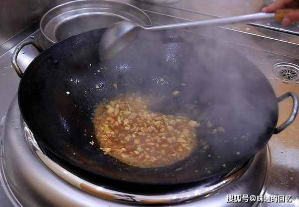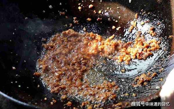 热锅凉油。倒入肉粒炒出香味,再倒入姜蒜继续翻炒。加入豆瓣酱6克,炒出豆瓣酱的红油以后,老干妈豆豉5克,翻炒均匀。