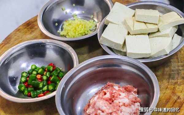 准备老豆腐一块,切成均匀厚片;猪肉一小块先切成薄片再剁成肉末;生姜一块拍散后切成姜末;小米椒几个切成圈;线椒两根切成小段;放在一起用来配色。