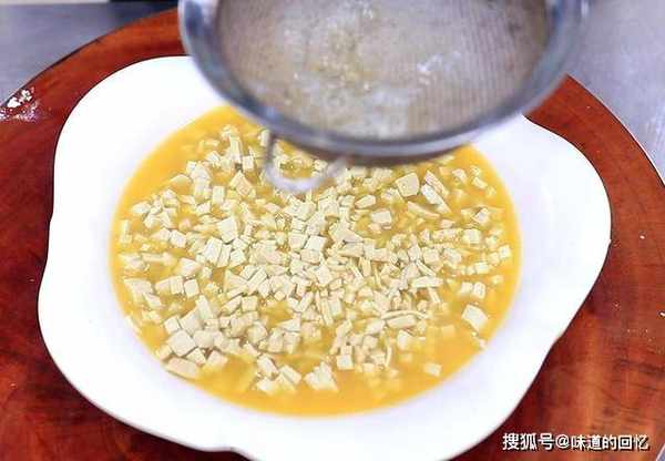 ,切成碎丁装入盘中;把鸡蛋液倒在滤勺中,筛出里面的气泡和没有搅散的鸡蛋清,否则不够平滑,淋入豆腐中,再把豆腐摊平,用保鲜膜盖住放入蒸锅中,蒸8分钟即可。