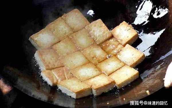 油烧至冒青烟时倒出,加入一勺凉油撒入少许食盐,把切好的豆腐下锅,豆腐要平整的铺在锅中才能均匀受热不易破碎。