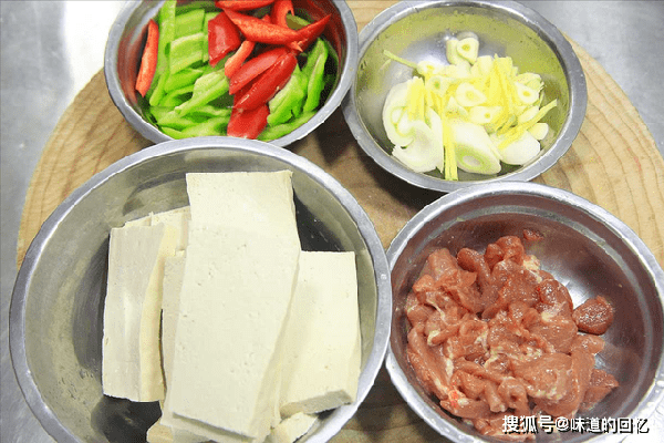 新鲜的豆腐一块,切成薄片。青、红椒两个从中间划开,斜刀切成块放在盆中;大葱白一小段切成马蹄片;生姜一小块切成姜片;大蒜几片切成蒜片。