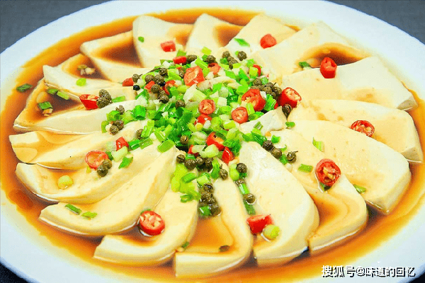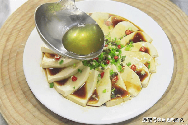 。蒸好后把汤汁倒掉不要,把调好的料汁倒在蒸好的豆腐上,撒上葱花、蒜末和小米椒,抓上几粒花椒。