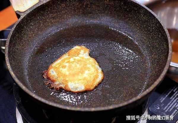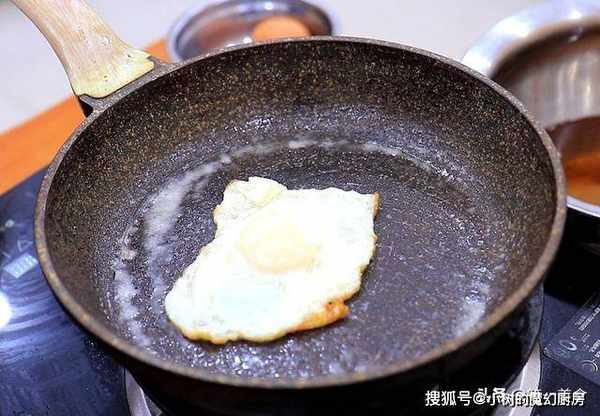 同样烧油润锅,撒上适量的食盐,把鸡蛋打在食盐上面,开小火慢慢煎,