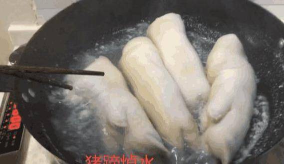 煮猪蹄,在另一个锅中加入猪皮和猪头的肉汤,再煮一个小时,然后煮猪蹄