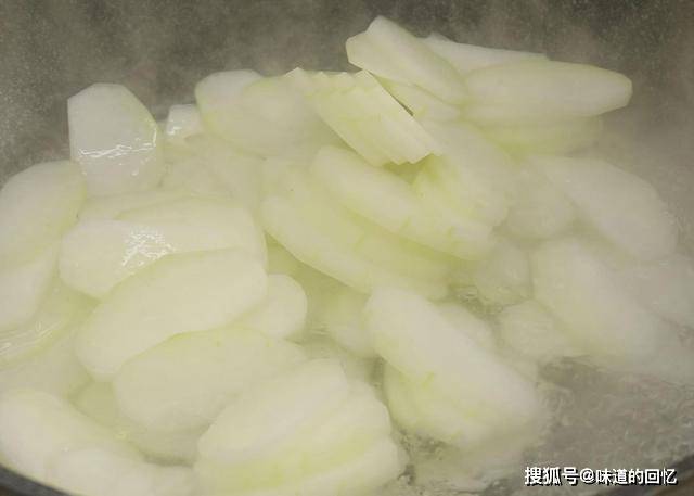 烧半锅开水, 倒入冬瓜汆煮一下,大火30秒钟, 冬瓜煮成半透明状就可以了,倒出来控一下水分。