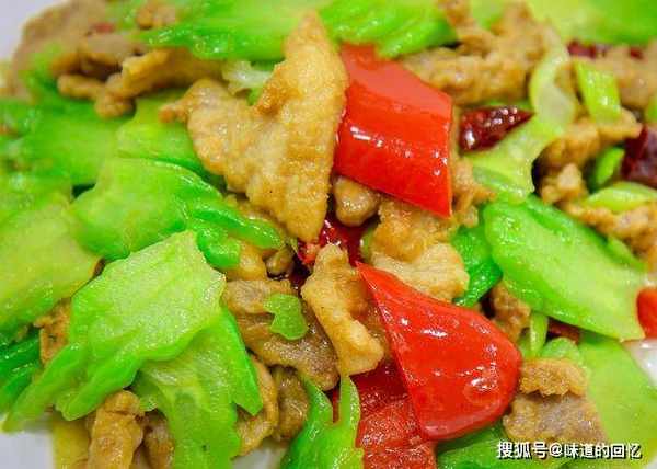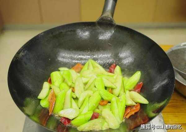 锅内再烧油,倒入葱姜红干椒翻炒出香味来,闻到葱香味的时候,倒入苦瓜和红椒,开大火翻炒,再倒入肉片,起锅淋入料酒。