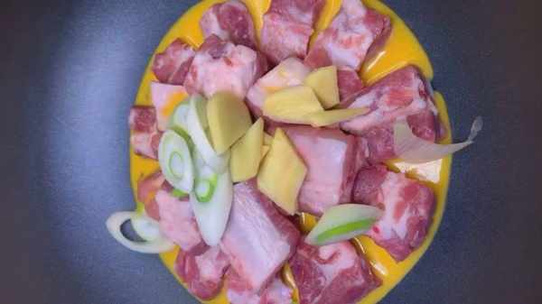 1、一、备好一根鲜排骨,把其洗净,然后切碎,倒进锅里,然后放入两个鲜蛋液,还有少量葱段、姜片(这种腌制方法与每个人过去的方法都有很大不同)。