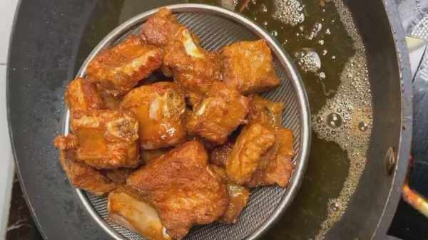 3、再则是煎排骨,掌握火候,在正常的情况下,用油烧到6-7热的时候放入锅内比较适宜,同时,小火浸炸,可省略复炸这一步骤,在进行复炸,复炸,更是蒜香排骨生产的一个先决条件。