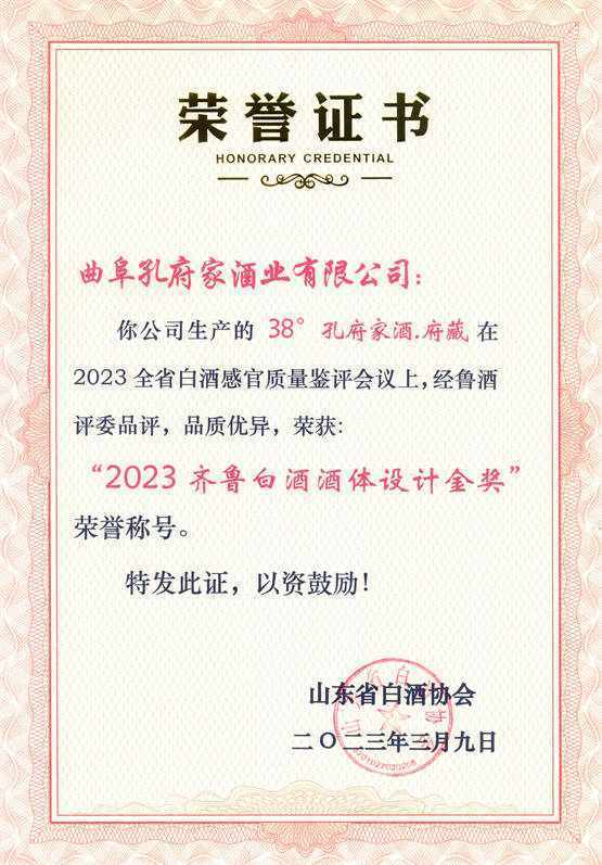 孔府家酒业产品孔府家酒·新府藏(风/雅/颂)喜获“2023齐鲁白酒酒体设计金奖”。