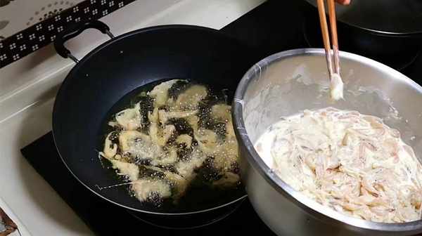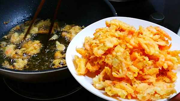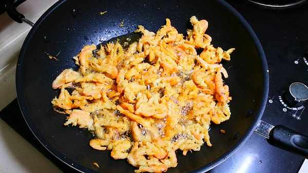 3.接着起锅加多一点的植物油,烧至油温6~7成热时,放入裹好面糊的小河虾,然后用筷子搅拌一下,防止小河虾全都粘连到一起,如果小河虾较多,不要一下全倒入,需要分几次来炸,全程中火炸至河虾变色,呈金黄色后控油捞出装入盘中备用。