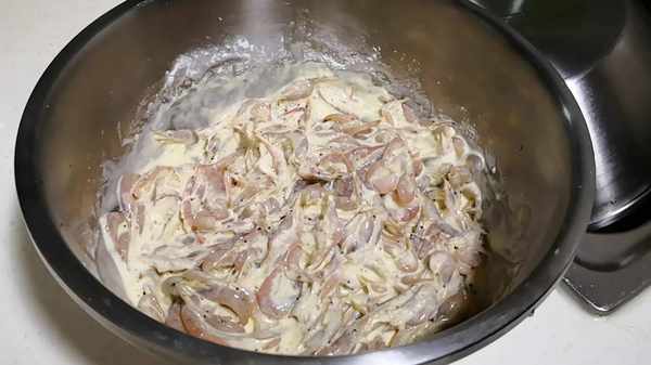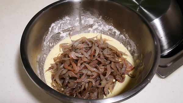 然后再将腌制入味的小河虾倒入面糊中,搅拌均匀使每个小河虾都均匀地挂满面糊。