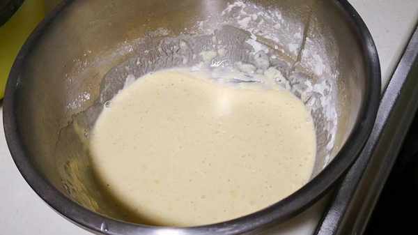 2.然后我们调个面糊,盆中分别加入两勺面粉、一勺淀粉、一个鸡蛋,适量的食盐,胡椒粉、花椒粉,搅拌均匀后再加入清水,将面糊调至酸奶拉丝状即可。
