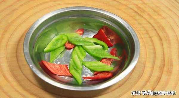 红椒和青椒各半片,都斜刀切成片,青椒红椒一起用来配色,比较好看。
