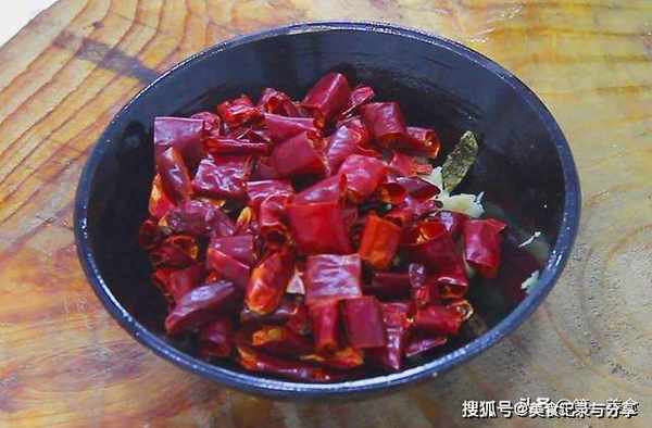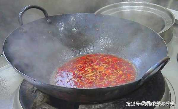 翻炒出红油放入蒜末,姜末,花椒和干辣椒,翻炒出蒜香,再加入适量清水,放入一块