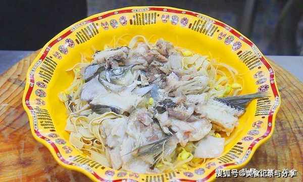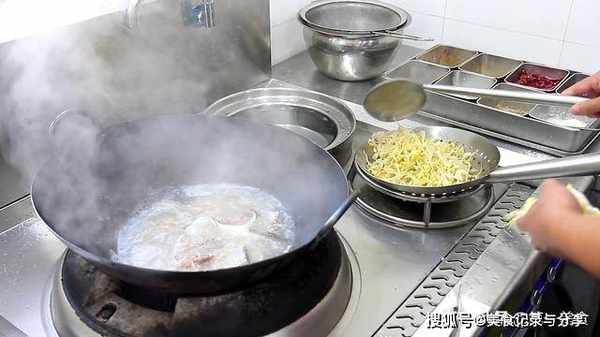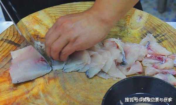 同样去除另一半鱼,把鱼骨剁成小段,鱼头从中间剁开,清洗干净后,放在盆里,剔除鱼的大骨,鱼皮照下,斜刀片成鱼片。