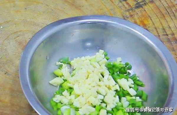 下面,再准备一下激油用的小料,小葱切成葱花,放在盘中,大蒜拍扁,切成碎末。