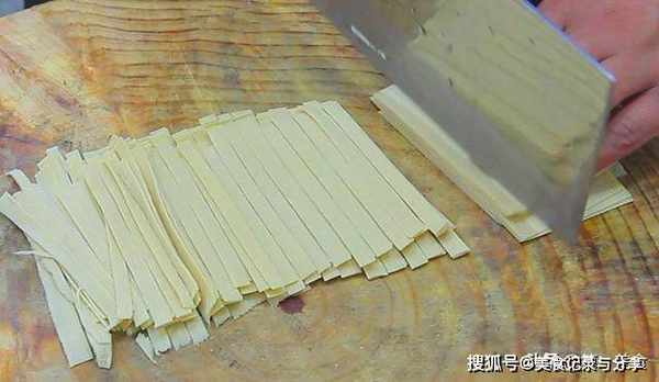 在腌制的时间,我们再准备一下配菜,豆腐皮两张,划成两片,再切成丝。
