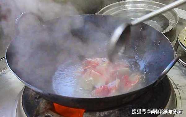 接着开始激油,锅内烧油,把油烧至7成热,在勺子中放入